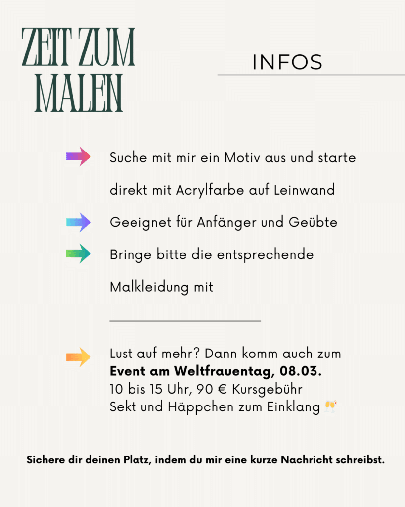 Falls Du und / oder deine Freunde an einem Malkurs interessiert bist / seid, dann schreib mir an kontakt@auris-kustwelt.de deine Wünsche und Vorstellungen. Wir finden etwas Passendes.